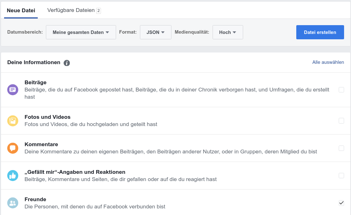 Auf der darauf folgenden Seite können jegliche Listen exportiert werden. Wir machen hier nur bei „Freunde“ ein Häckchen.