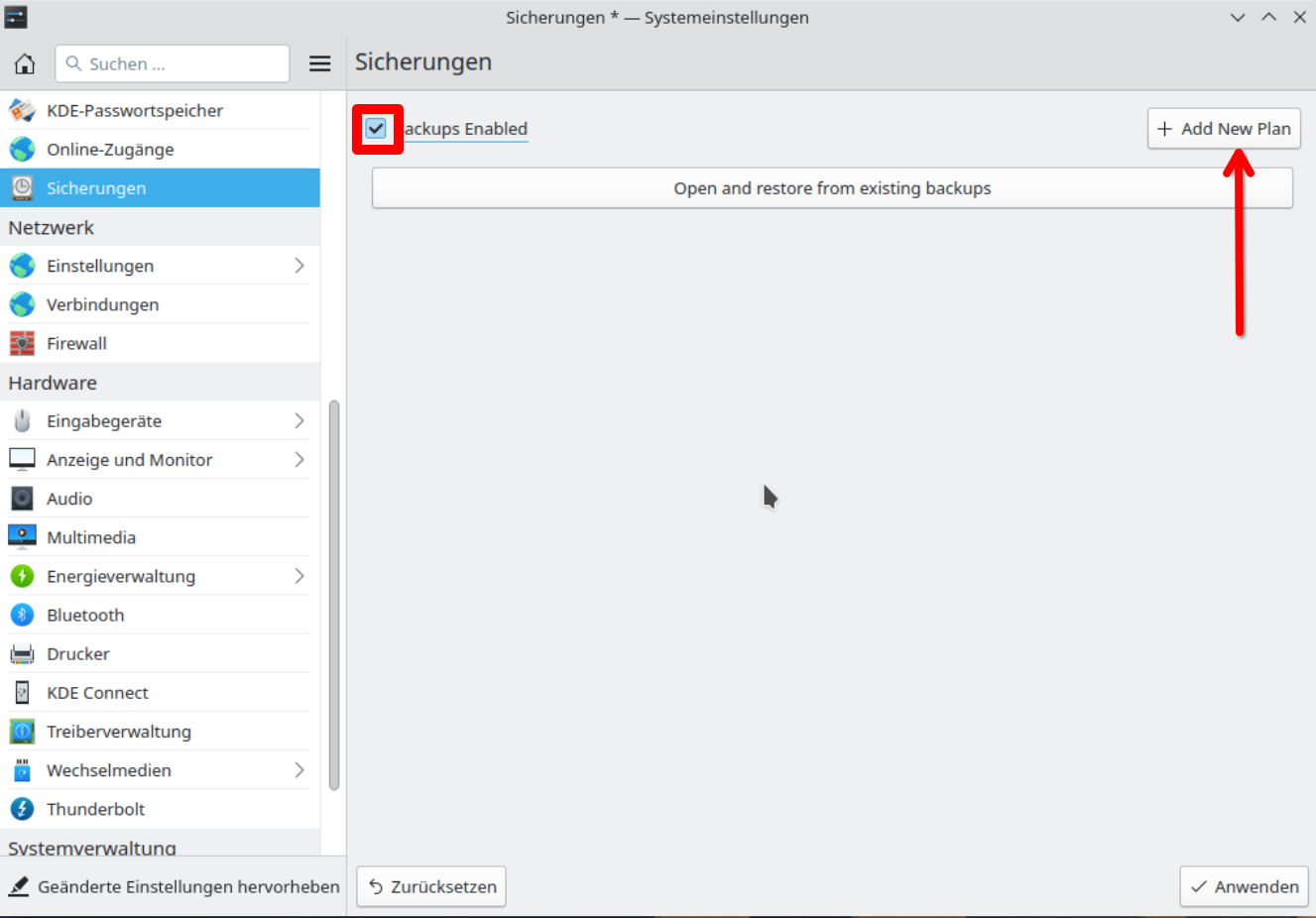 Als nächstes machst du ein Hakerl bei „Backups enabled“ und klickst auf das Plus bei „Add New Plan“.