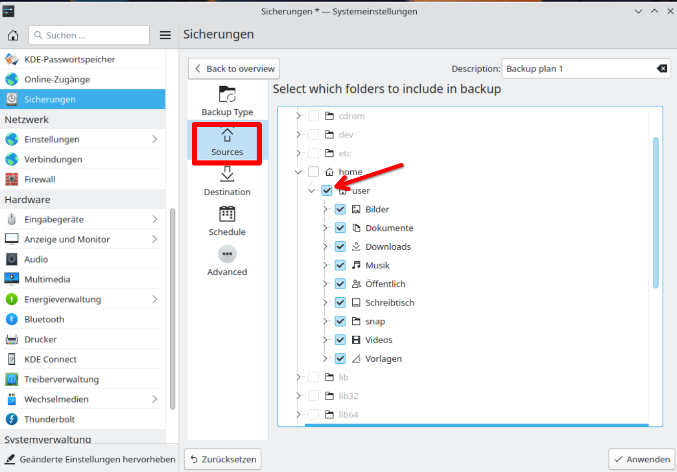 Wir springen nun unter Sicherungen gleich zum Zweiten Punkt „Sources (Quelle)„ und wählen unser persönliches Benutzerverzeichnis aus.