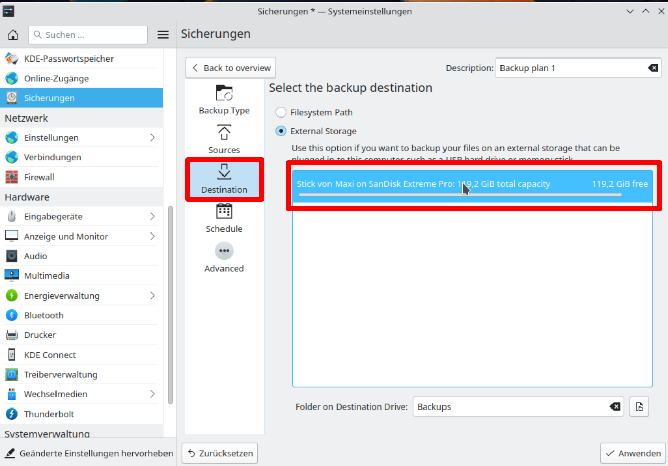 Als Ziel „Destination“ wähle ich einen angeschossenen USBstick aus.