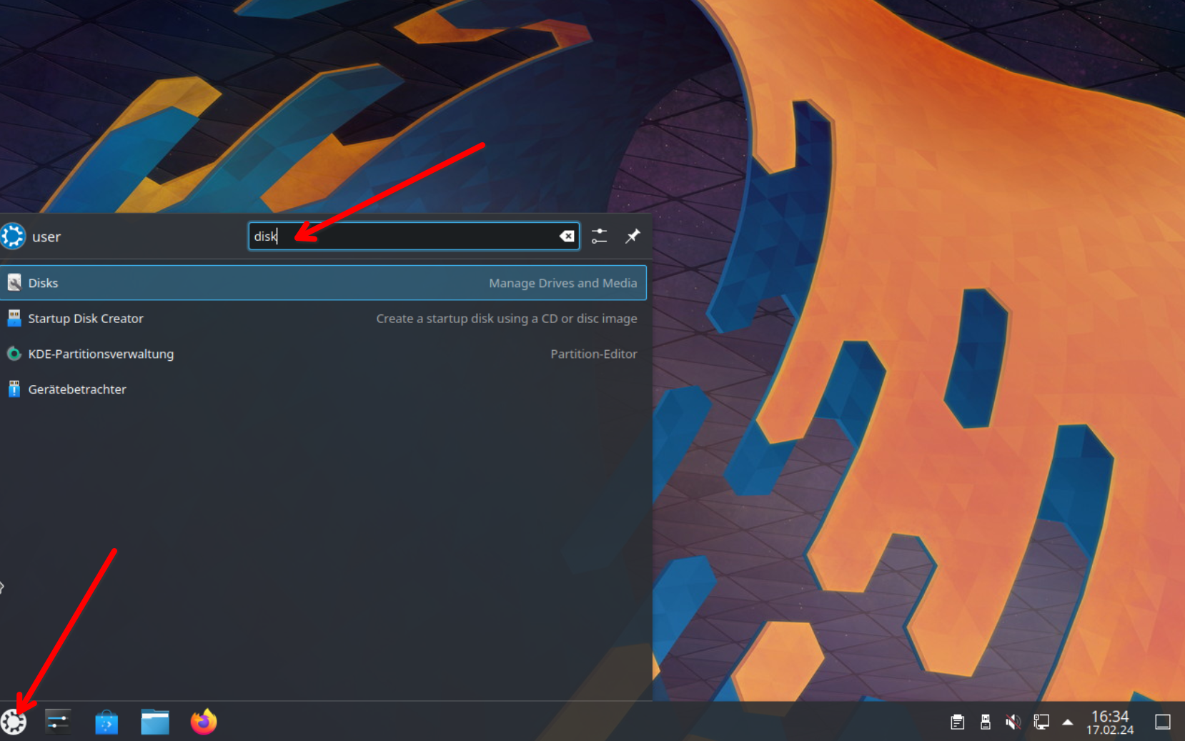 Zum Formatieren von Datenträgern z.B. USB-Sticks ist die Laufwerksverwaltung (Disks) zuständig. Diese kannst du direkt aus dem KDE-Startmenü links unten aufrufen in dem du das Startmenü anklickst und einfach drauf losschreibst.