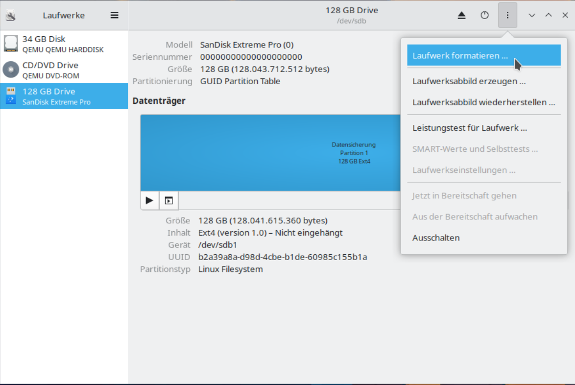 Als nächsten begeben wir uns rechts oben auf das Dreipunktmenü (Laufwerkseinstellungen) und wählen dort „Laufwerk formatieren“ aus. Achtung: „Formatieren löscht alle Daten auf dem ausgwählten Datenträger“