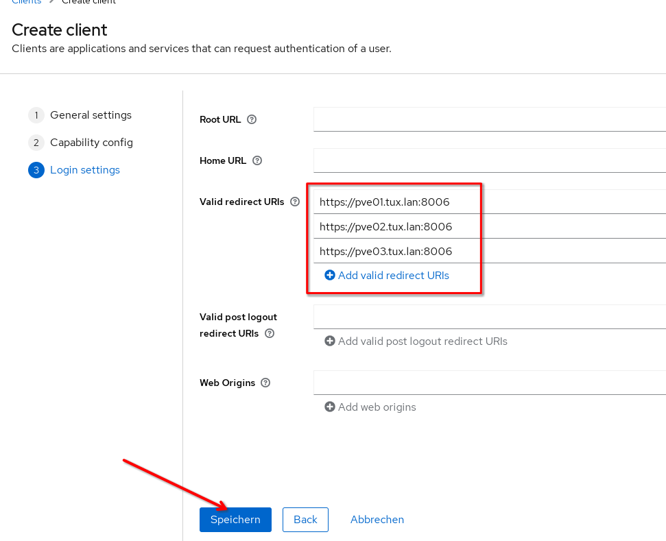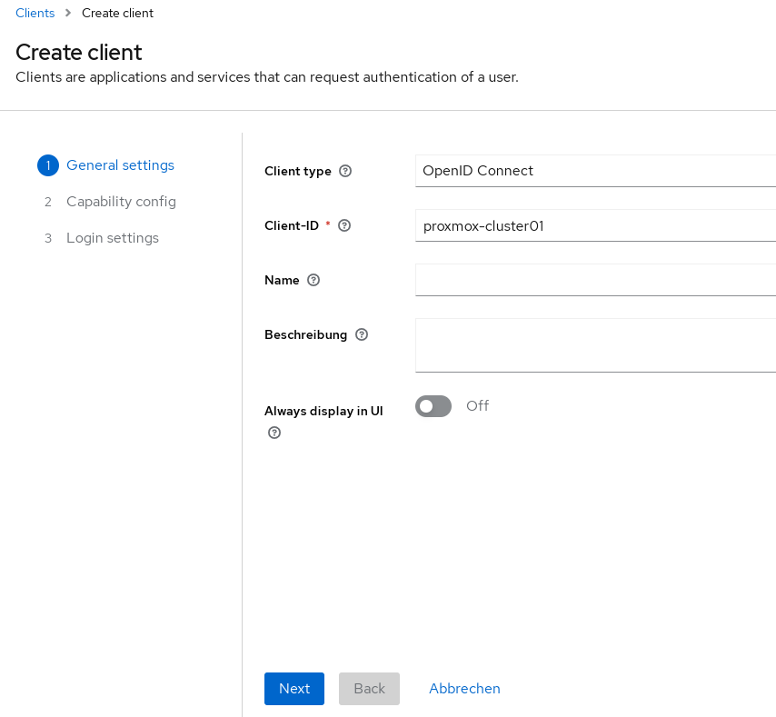 Unter dem Realm „ucs“ wird ein neuer Client names „proxmox-cluster01“ hinzugefügt. Die Basiseinrichtung erfolgt in 3 Schritten: