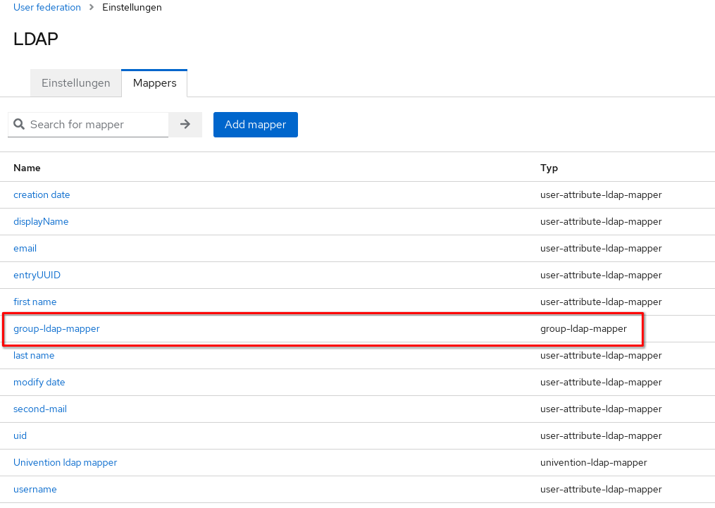 Um überhaupt zu den LDAP-Gruppen zu kommen, muss ein „group-ldap-mapper“ hinzugefügt werden. Hierzu wechselt man im Menü von Keycloak auf „User federation“ und bearbeitet den „ldap-provider“. Im TAB Mappers, fügt man nun den „group-ldap-mapper“ hinzu.