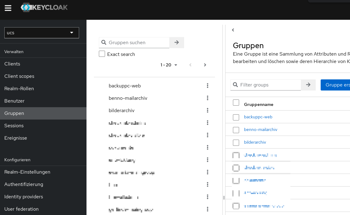 Danach „Speichern“, nochmal einsteigen und rechts oben auf „Aktion → Sync LDAP groups to Keycloak“ anklicken. Damit sollte eine grüne Infomeldung aufpoppen wo die gesyncten Gruppen angezeigt werden. Damit sind unter „Gruppen“ nun auch alle Gruppen und Groupmembers in Keycloak ersichtlich.