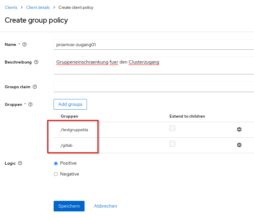 Die folgenden zwei Gruppen „testgruppebla“ und „gitlab“ sollen also berechtigt sein sich auf dem Cluster einloggen zu können.