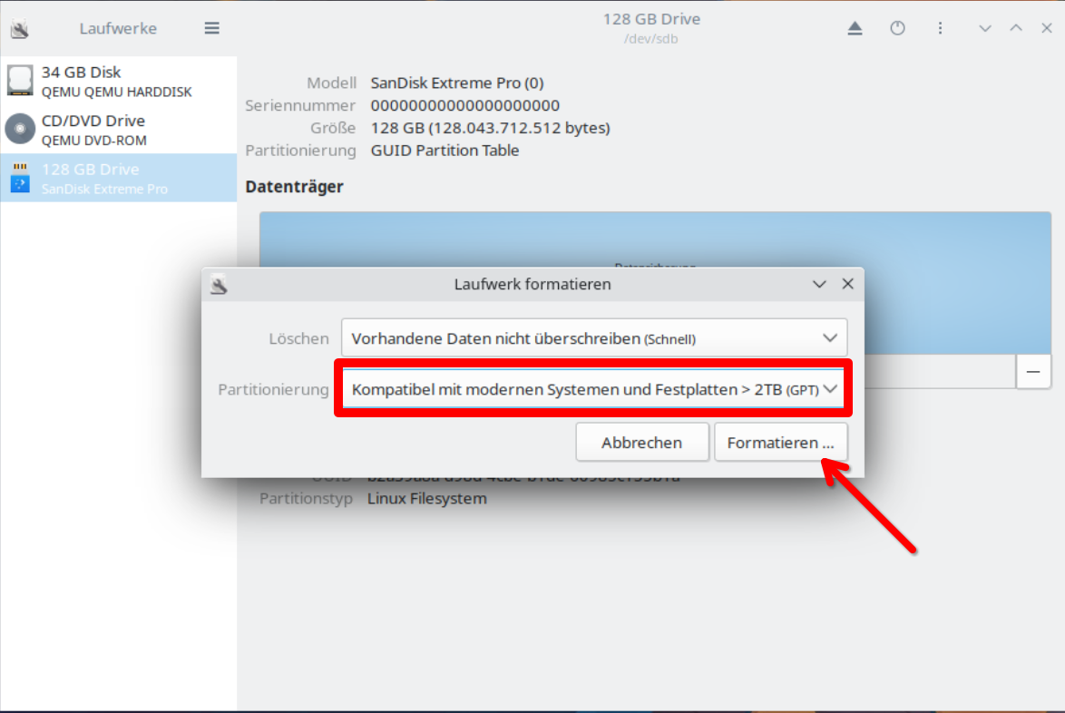Wähle dort bei Partitionierung „Kompatibel mit modernen Systemen und Festplatten“ aus und klicke auf „Formatieren“. Im nächsten Fenster erscheint nochmal eine Sicherheitsabfrage wo nochmalig ausführlich erklärt wird das deine Daten auf dem Zieldatenträger gelöscht werden. Ist das für dich ok, dann klicke nochmalig auf „Formatieren“. Dies dauert nun ein paar Sekunden.