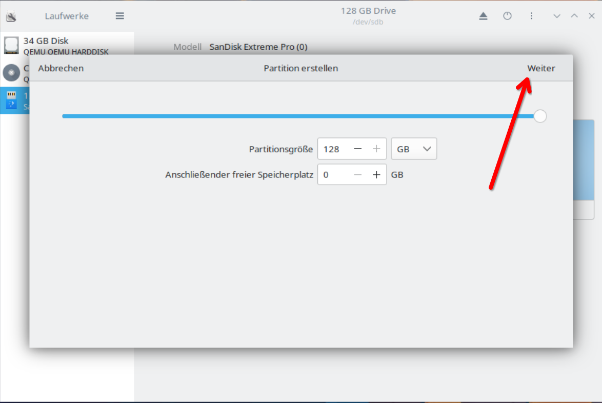 Leider ist die Übersetzung hier nicht ganz richtig. Da an diesem Punkt noch nicht formatiert wurde, sondern lediglich eine neue Partitionstabelle angelegt wurde. Um nun tatsächlich zu formatieren klickst du nun auf das Kleine „Plus“ und auf „Weiter“.