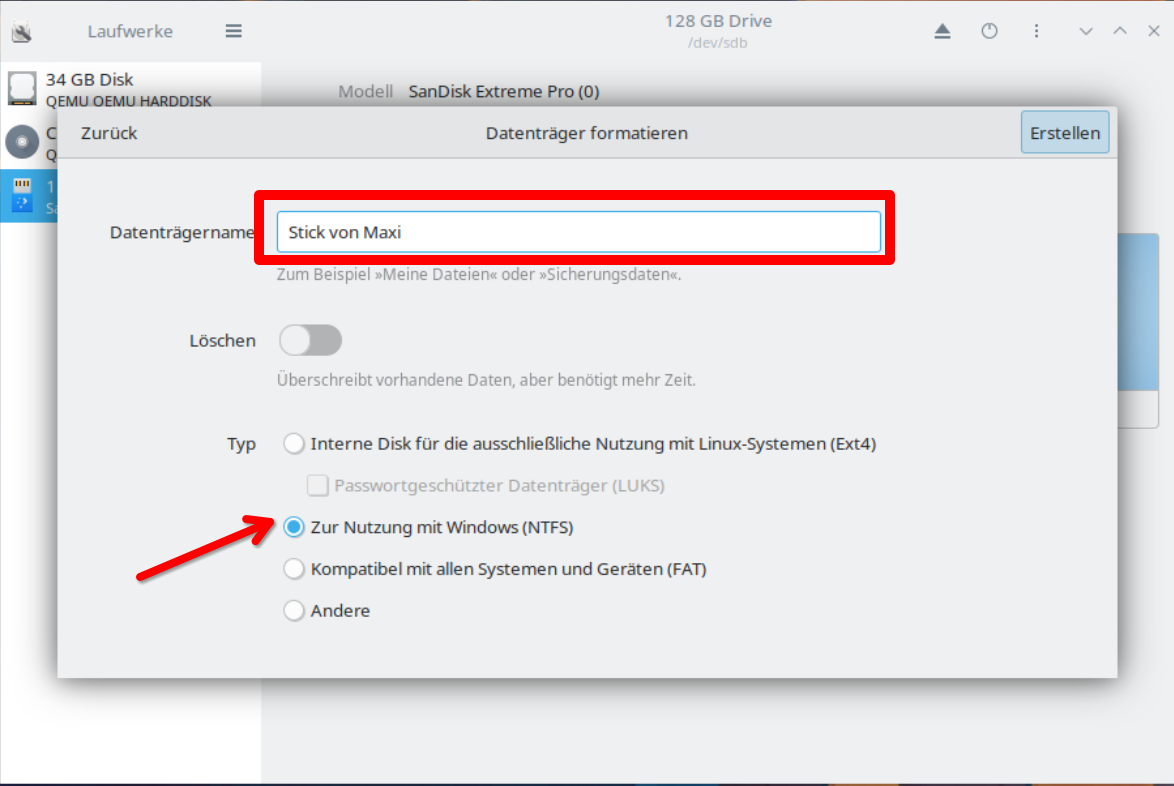 Im nächsten und letzten Schritt hast du noch die Möglichkeit dem Datenträger einen Namen zu geben und den Typ des Dateisystem auszuwählen. Triffst du hier keine Entscheidung wird der Stick an jedem Computer und Betriebssystem funktionell sein.