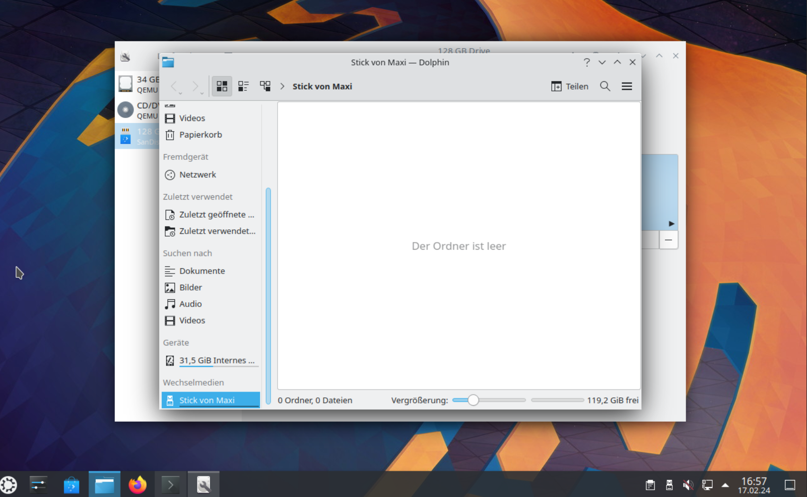 Zum Formatieren von Datenträgern z.B. USB-Sticks ist die Laufwerksverwaltung (Disks) zuständig. Diese kannst du direkt aus dem KDE-Startmenü links unten aufrufen in dem du das Startmenü anklickst und einfach drauf losschreibst.